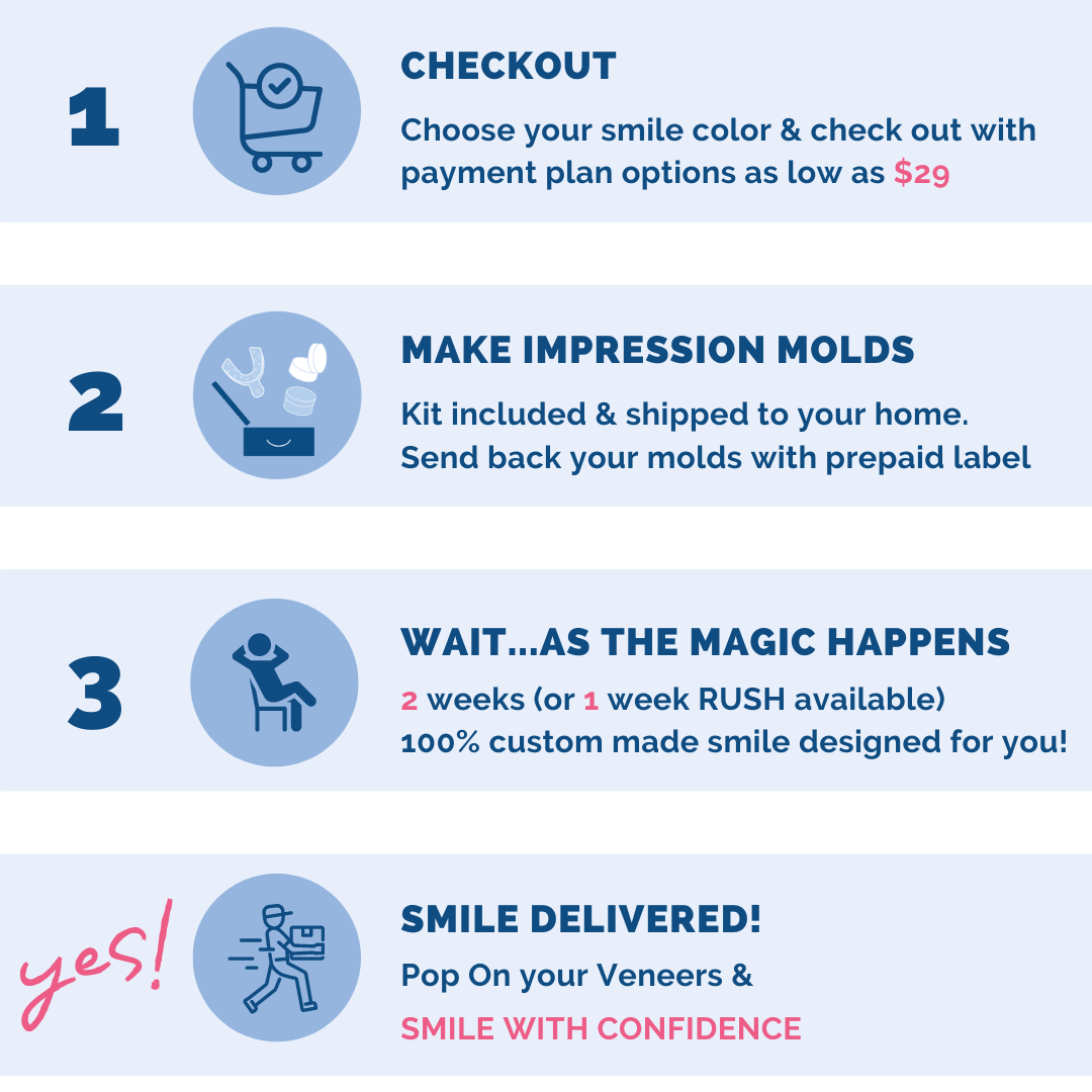 We are committed to delivering a smile that you’ll love! We always include a 30 day warranty. In case there’s any issue with the fit, we will remake your Pop On Smile up to two times. Our dedicated team is here for you every step of the way!